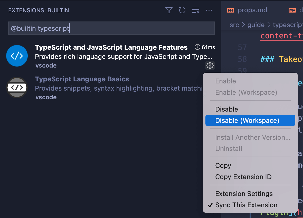 typescriptin the extension search box (do not remove@builtinprefix). - Click the little gear icon of "TypeScript and JavaScript Language Features", and select "Disable (Workspace)".